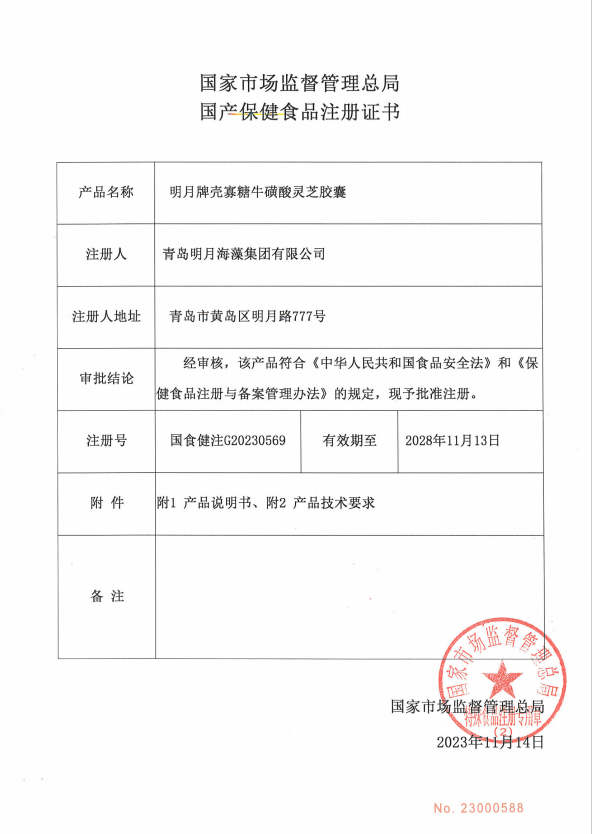 日前,青島明月海藻集團(tuán)“明月牌?殼寡糖牛黃酸靈芝膠囊”獲批國(guó)家市場(chǎng)監(jiān)督管理總局保健食品批件,注冊(cè)號(hào)國(guó)食健注G20230569。