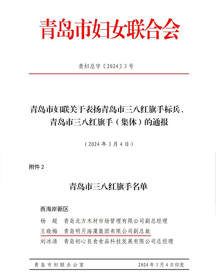 近日,青島市婦女聯(lián)合會發(fā)布《關于表揚青島市三八紅旗手標兵、青島市三八紅旗手(集體)的通報》,其中,青島明月海藻集團有限公司副總裁王曉梅同志獲評青島市三八紅旗手榮譽稱號。