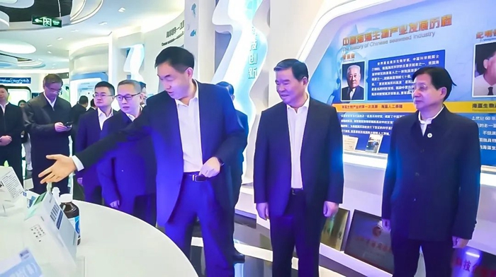 在參觀中,張國防向一行人詳盡介紹了明月海藻“海洋十年”國際合作中心的有關情況,并展示了企業深耕一棵海藻,專注海藻活性物質高值化開發和應用,為海洋強國與健康中國方面的所作出的努力與成果。