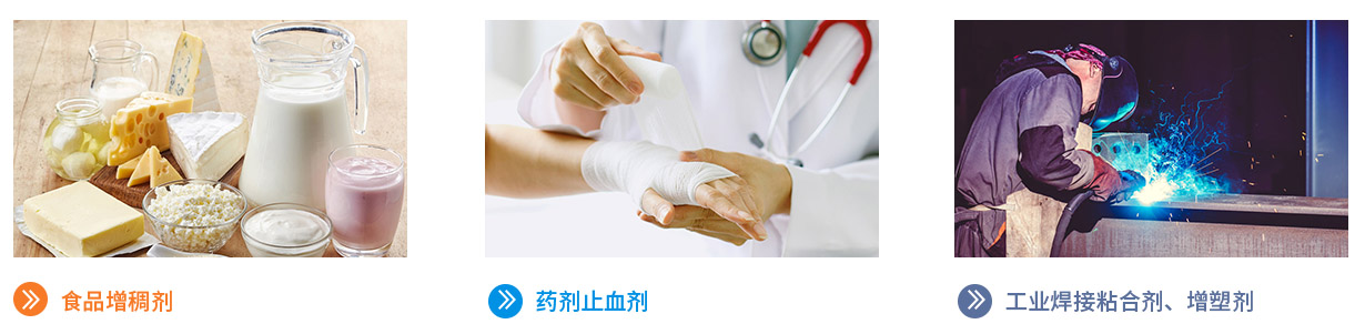 1、用于食品的粘結(jié)劑、增稠劑、保水劑,在食品中鹽分的影響下,鈣-鈉交換,形成增稠性的高鈣膠,多為配合海藻酸鈉使用。